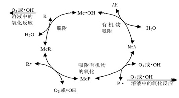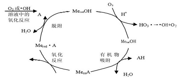 (2)、催化劑不但可以吸附有機物,而且還直接與臭氧發(fā)生氧化還原反應,產(chǎn)生的氧化態(tài)金屬和羥基自由基可以直接氧化有機物。